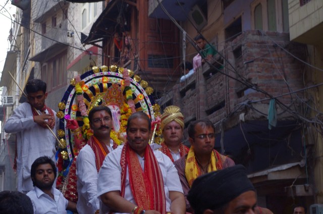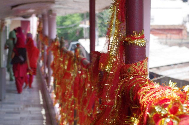 no entiendes nada y no sabes lo que va a pasar a la vuelta de la esquina. Sorprendentes estatuas, representaciones humanas en forma de collage con papel de charol, pasadizos llenos de agua por los que debes arrastrarte a cuatro patas y recovecos y retorcidas escaleras han covertido un edificio normal y corriente próximo a la estación de tren de Amritsar en un verdadero lugar de devoción un poco kitsch (tengo que decirlo, con el máximo respeto eso sí). La verdad que una vez más, mi ignoracia sobre la cultura y religión hindúes quedó manifiesta y me sentí entre divertido y frustrado al no entender toda la simbología que me rodeaba ni todo lo que pasaba a mi alrededor ¿por qué las mujeres tenían que tocar una campana al entrar, o por qué acompañadas muchas de ellas de sus maridos ataban una cinta roja brillante en la barandilla de la terraza? Son preguntas que para mí siguen sin respuesta.
