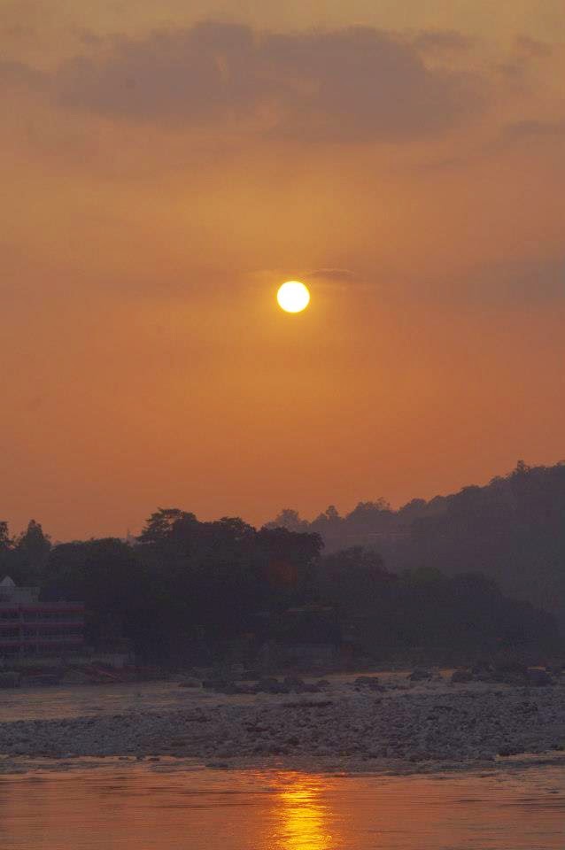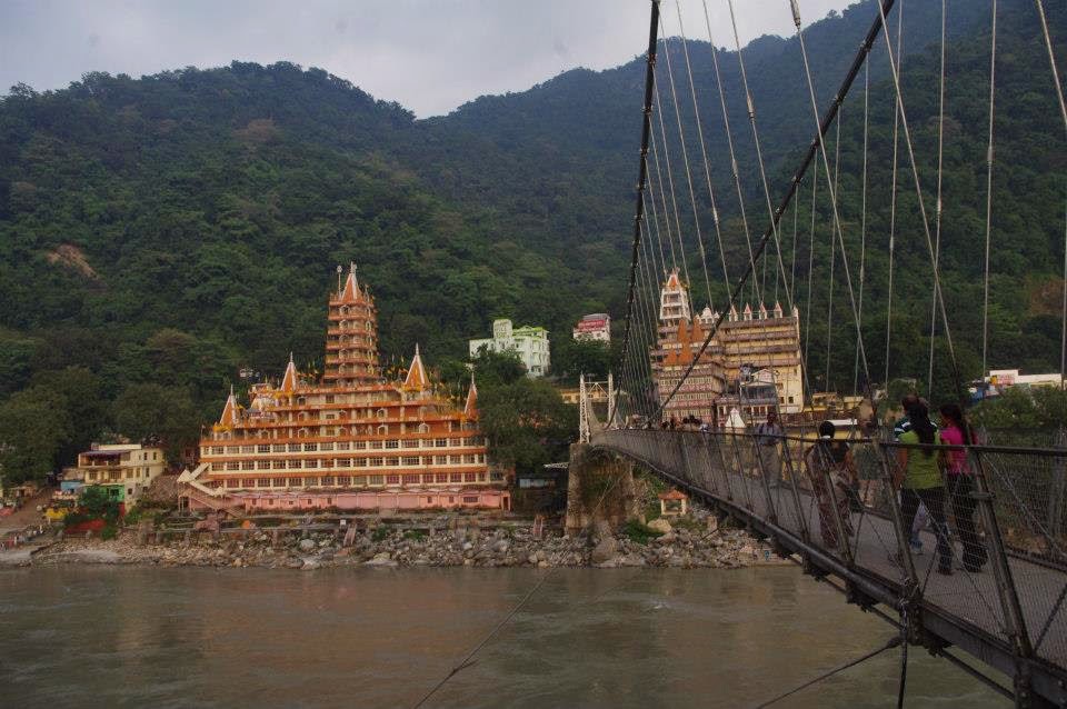 Hay que reconocer que Rishikesh es bonito. Para llegar a los ghats en la orilla del rio, se debe atravesar un enorme puente colgante de hierro, el Lakshman Jhula. El puente fue construido en 1839 y desde él las vistas del río, las montañas y la ciudad son fantásticas. Es bastante estrecho y está muy transitado; por él continuamente parecen estar pasando personas, yendo y viniendo: santurrones barbudos ataviados con sus ropajes naranjas, turístas, hippies trasnochados, mujeres indias rodeadas de niños, motos que se abren paso a pitidos incesantes y vacas que eventualmente se sientan en medio del camino a descansar causando enormes aglomeraciones y atascos, que a su vez provocan más pitidos de motos.
