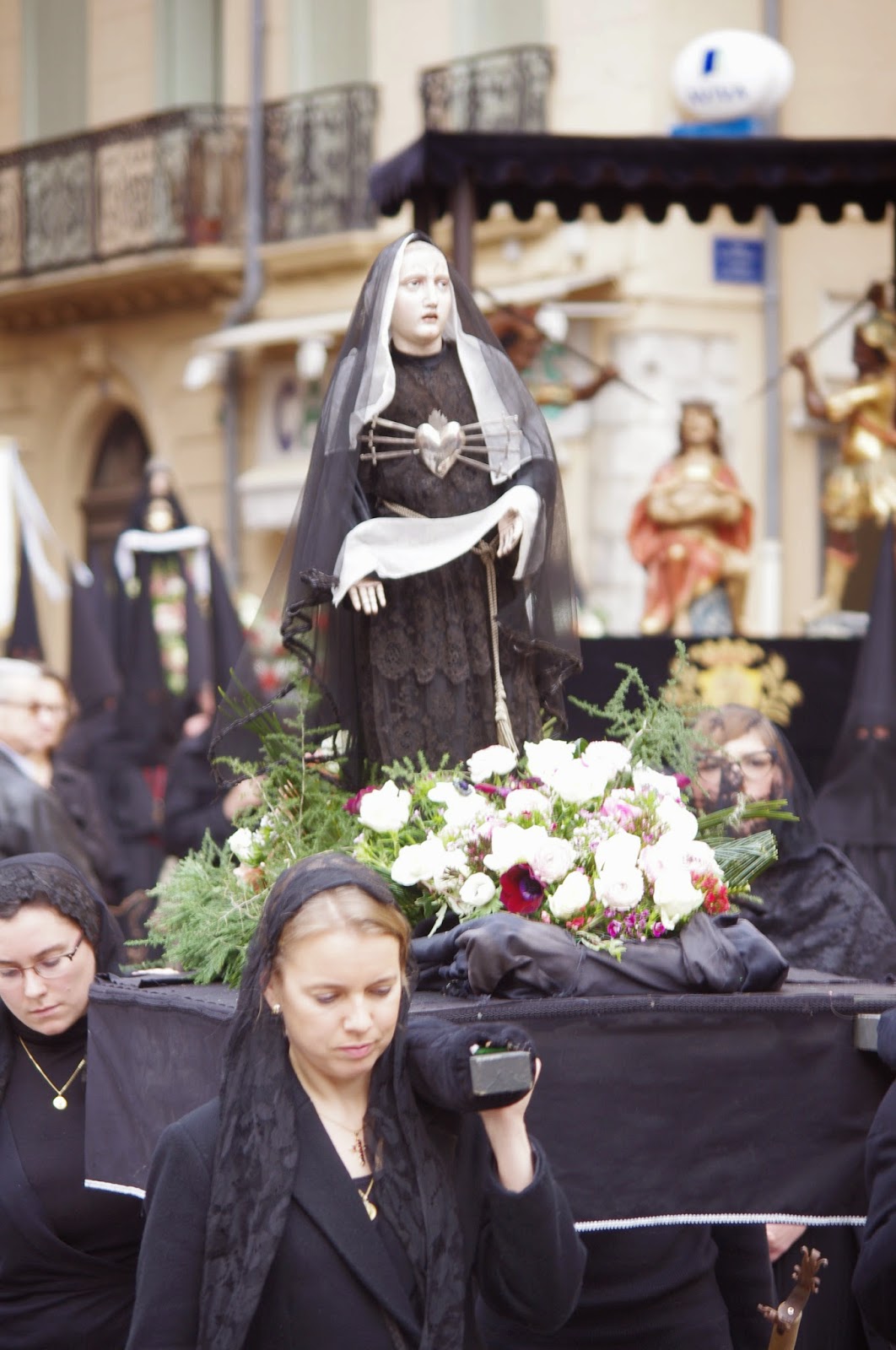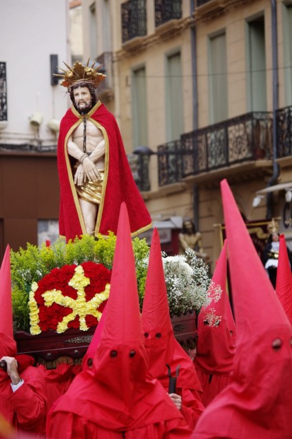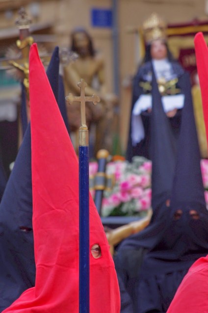 Lo cierto es que no soy yo un gran entendido en el tema y no he asistido a demasiadas procesiones, de hecho fue la primera, y por accidente, curiosamente, tuvo que ser en Francia, no en España. Aún así, he de reconocer que esa mezcla entre la sacralidad y espiritualidad del hecho religioso y el puro folclore más secular no dejaron de impresionarme aunque el sobrecogedor realismo de los misterios, la solemnidad del acto, el redoble constante de los tambores y el fuerte contraste entre el rojo y el negro de las capuchas de los penitentes le dan cierto halo funebre y lugubre a la marcha que, por momentos, hizo que me estremeciera un poco.