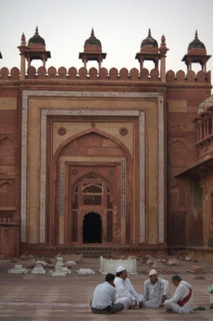 Cuando entramos en Fahtehpur Sikri estaba atardeciendo. Ya no había demasiada gente recorriendo el recinto y he de confesar que a primer golpe de vista, me sentí impresionado por la majestuosidad del conjunto, por el juego de luces y sombras del ocaso y por el ambiente religioso de los fieles que acudían a la mezquita Jama Masjid situada en el interior.