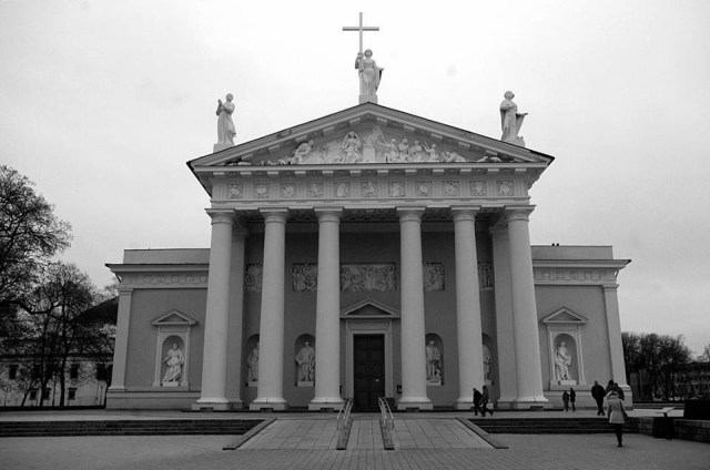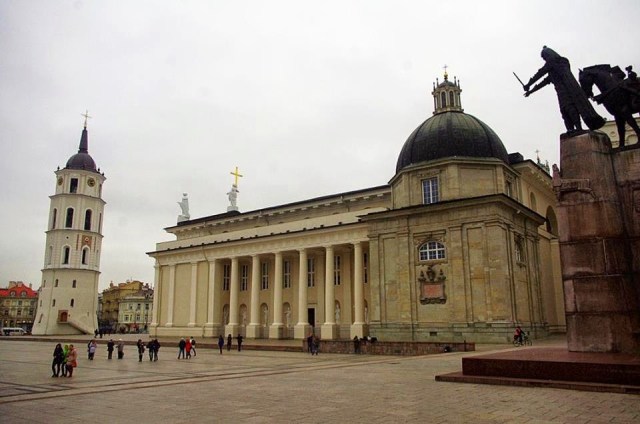 Al final de la calle Gedimino, se vislumbra la imponente plaza de la catedral, la mayor plaza de la ciudad, blanca y enorme, elegante y sobria que constituye quizás unos de los símbolos más identificativos de Vilnius. La catedral con su torre de la campana dominan este espacio público, punto de reunión y de encuentro para los habitantes de Vilnius, una plaza que en noviembre aparecía casi vacía, desangelada y triste, con algún que otro paseante solitario, algún turista perdido y grupos de jóvenes dando una vuelta y retando al frío.