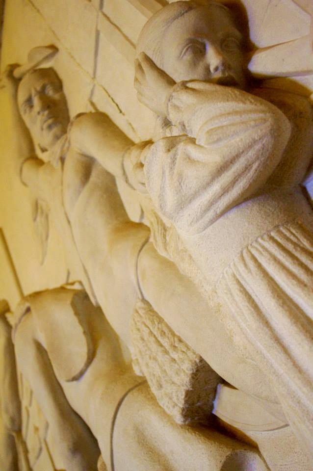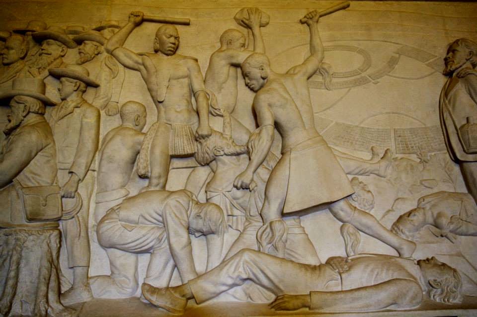 El interior es todavía más grotesco con unos enormes frisos representando escenas de batallas dantescas donde unos inmensos negros vestidos con atuendos tribales amasacraban a indefensas mujeres y sus hijos ante la impotencia heroica de sus maridos y padres, que acababan triunfando finalmente a pesar de la crueldad de los «salvajes»