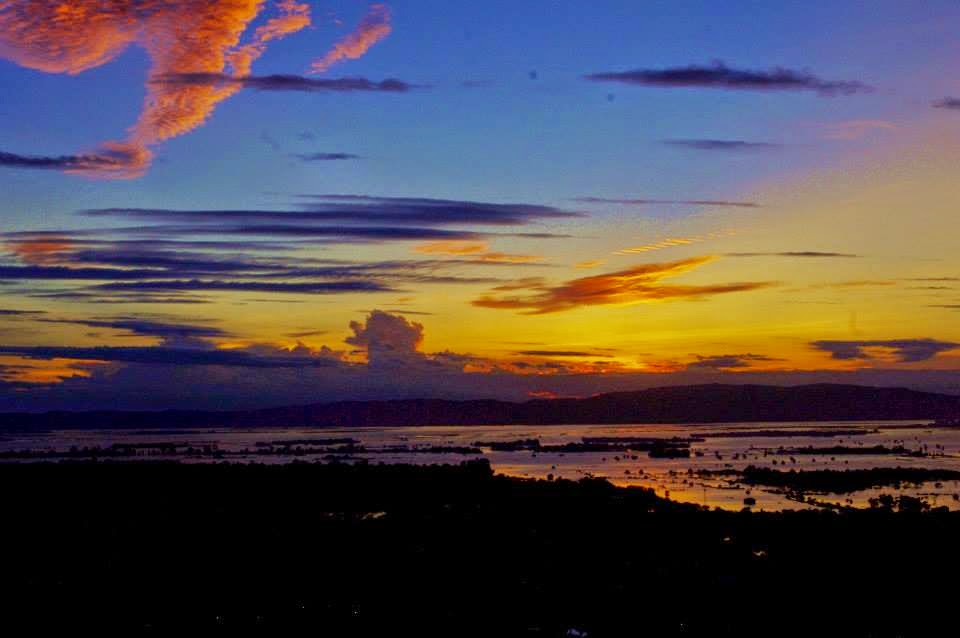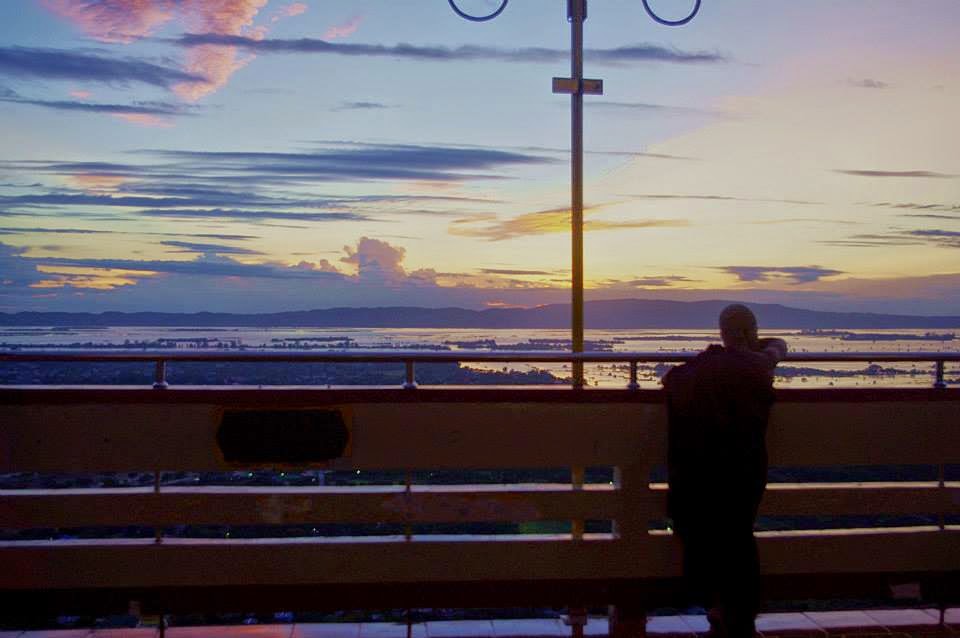 Ya desde arriba, las vistas eran impresionantes y fue allí donde fuimos conscientes de la enorme explanada en la estaba situada la ciudad de Mandalay. Era época de lluvias y a pesar de que la ciudad está ubicada en la famosa zona seca, toda la inmensa llanura estaba inundada por partes ya que el río Irrawaddy parecía haber sido liberado y haberse escapado de su cauce. El reflejo del sol apagado en las aguas del río, las nubes teñidos de tonos ocres y granates y las luces de las casas salpicadas en el horizonte como un verdadero mar de estrellas daban al entorno un aspecto imponente.