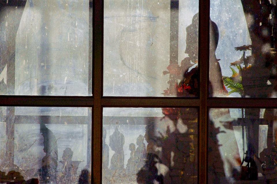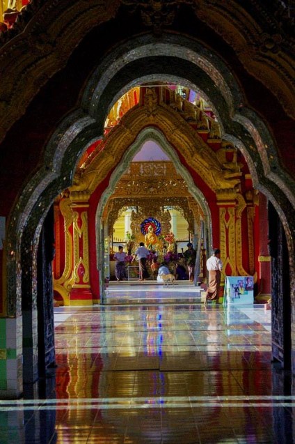 Nuestra primera parada fue el monasterio de Shwenandaw, situado muy cerquita de la colina de Mandalay. El monasterio es un histórico edificio construido enteramente de madera de teca, material puramente local y que goza de muy buena reputación en estas latitudes. El monasterio de Shwenandaw es el único superviviente del antiguo Palacio Real de Mandalay, que lamentablemente fue destruido en parte en la Segunda Guerra Mundial y es un buen ejemplo de arquitectura tradicional birmana en madera de teca. El edificio fue desmantelado y reubicado fuera del Palacio en 1880 por el rey Thibaw Min, tras la muerte de su padre, creyendo que el edificio estaba poseído por el espíritu de su progenitor y fue entonces cuando al edificio se le dio la categoría de monasterio. Fue precisamente eso lo que le salvó de la destrucción cuando el Palacio Real fue bombardeado años más tarde durante la Segunda Guerra Mundial. Hoy por hoy, el monasterio de Shwenandaw es famoso por sus imágenes de Buda de madera. Durante nuestra visita allí, nos tropezamos con nuestros primeros grupos de turistas, muchos de ellos chinos haciendo fotos como locos, y también con unos cuantos niños monjes que con sus trajes de color granate jugaban y se reían mientras nos observaban tímidamente desde el quicio de madera de alguna puerta o asomados a alguna ventana. Todo el lugar olía a viejo y con cada paso que dábamos, el crujir de la madera bajo nuestros pies recordaba continuamente lo endeble y lo frágil de la construcción a pesar de lo que, sorprendentemente, había sobrevivido a los avatares de la historia.