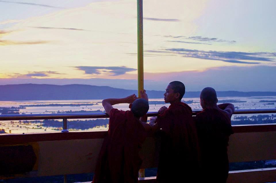 El atardecer fue quizás el mejor que vimos durante nuestro viaje a lo largo del país. Lógicamente, había bastantes turistas y muchos monjes, muy jóvenes, se acercaban a los extranjeros para practicar idiomas. Un hombre apostado en los alrededores nos pidió 1000 kyats por hacer fotos. El gobierno quería hacer caja a costa del turista extranjero que visitaba el país. A pesar de que 1000 kyats no era una gran suma de dinero (no llegaba ni a un euro), me fastidiaba bastante tener que darle dinero al gobierno y sostener todavía más un sistema corrupto y antidemocrático, así que intentamos evitar la tasa como fuese, pero al final no nos quedó más remedio que pasar por caja y sacar la cartera para pagar los 1000 kyats.