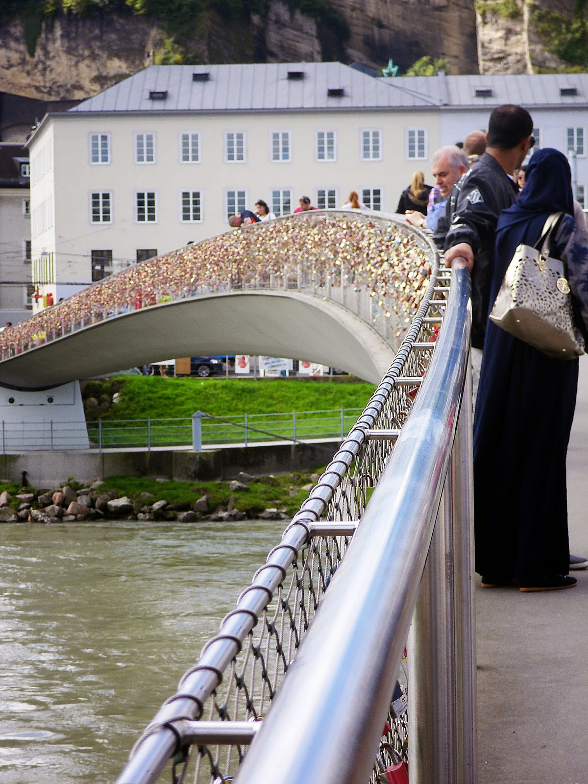 El rio Salzach atraviesa la ciudad y varios puentes conectan las dos riberas del río (uno de los cuales por cierto está lleno de los típicos candados, hortera oda a la eternidad del amor de las parejas que pasean, debe ser el puente número 20 que he visto así, hasta Orense tiene uno… Te dan ganas de ir con una cizalla y cargarte todos los candados jeje).