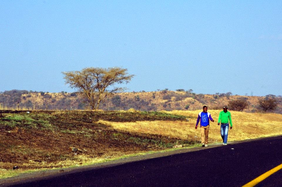 En el arcén de la autopista, durante todo el trayecto, se podía ver gente vagando sin rumbo, autostopistas, grupos de mujeres yendo sabe dios a donde, viajeros que recorrían la autopista a pié driblando entre un tráfico constante de rápidos coches caros y de lentas camionetas y destartalados autobuses atestados de gente.