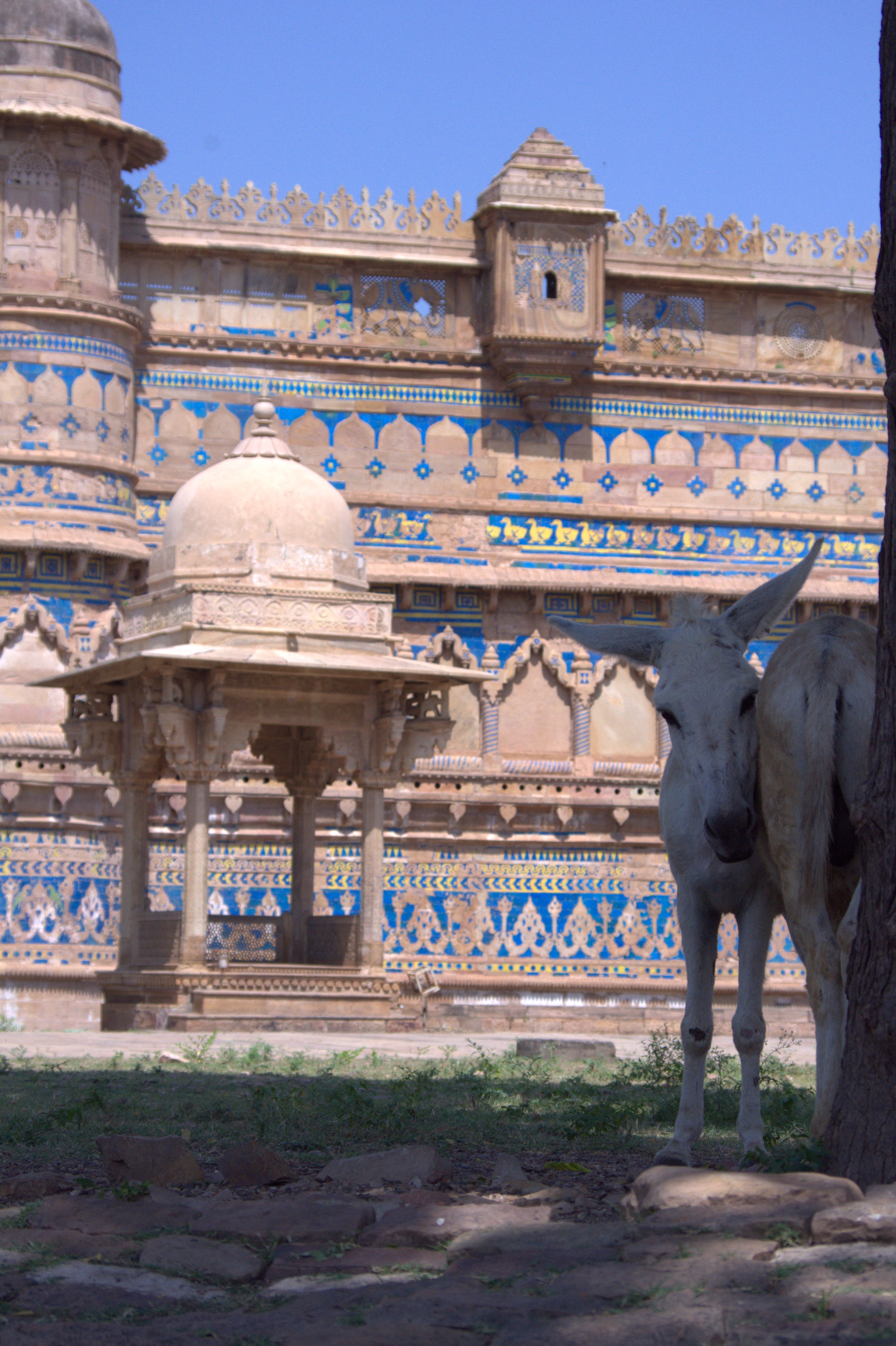 El fuerte era impresionante, con sus enormes torrejones cubiertos de destelleantes azulejos azules, quizás fue uno de los lugares más hermosos de todo nuestro viaje en la India. Había algo mágico en aquel lugar, casi irreal, que materializaba de una forma plástica el escenario de algún cuento de las mil y una noches. Las vistas desde lo alto de la colina eran fabulosas y se podía otear la inmensidad de la ciudad y sus alrededores, en la paz y el silencio que proporcionaba el estar lejos del caos del tráfico y del bullicio de las gentes y las calles de Gwalior. (Gwalior tiene el honor de ser la tercera ciudad más contaminada del planeta).